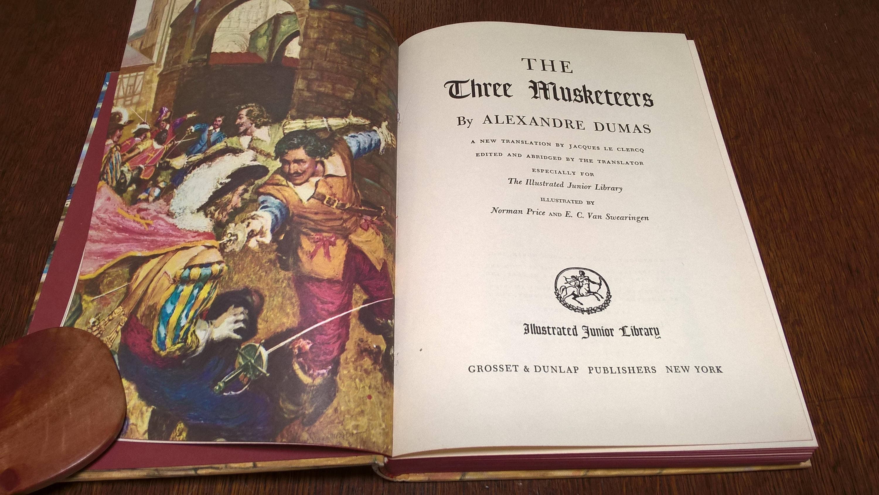 Written by Alexandre Dumas. Translated by Jacques Le Clercq. Illustrated by Norman Price and E. C. Van Swearingen. 1971 printing (first printing in 1953). Illustrated Junior Library, Grosset & Dunlap Publishers.