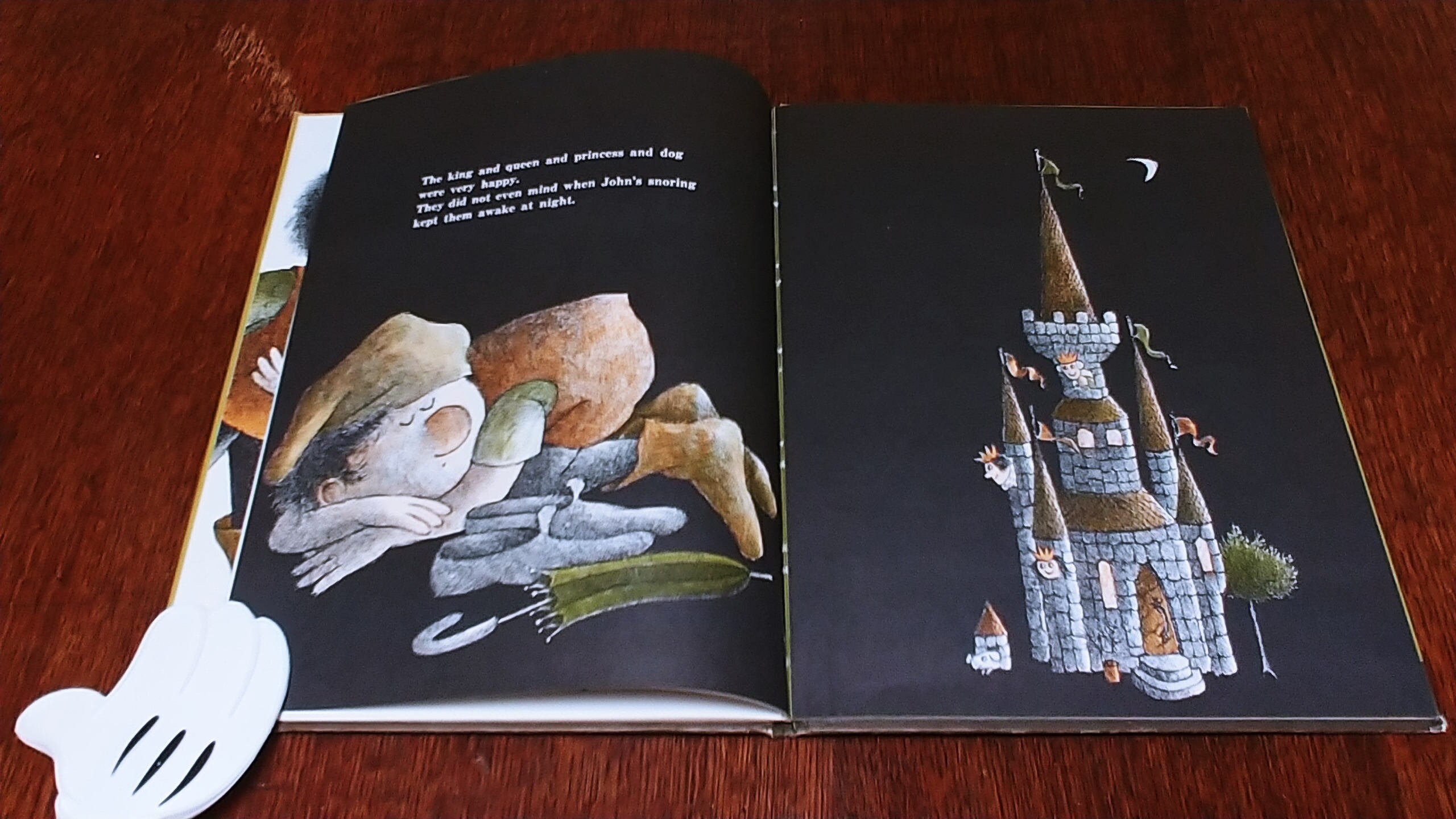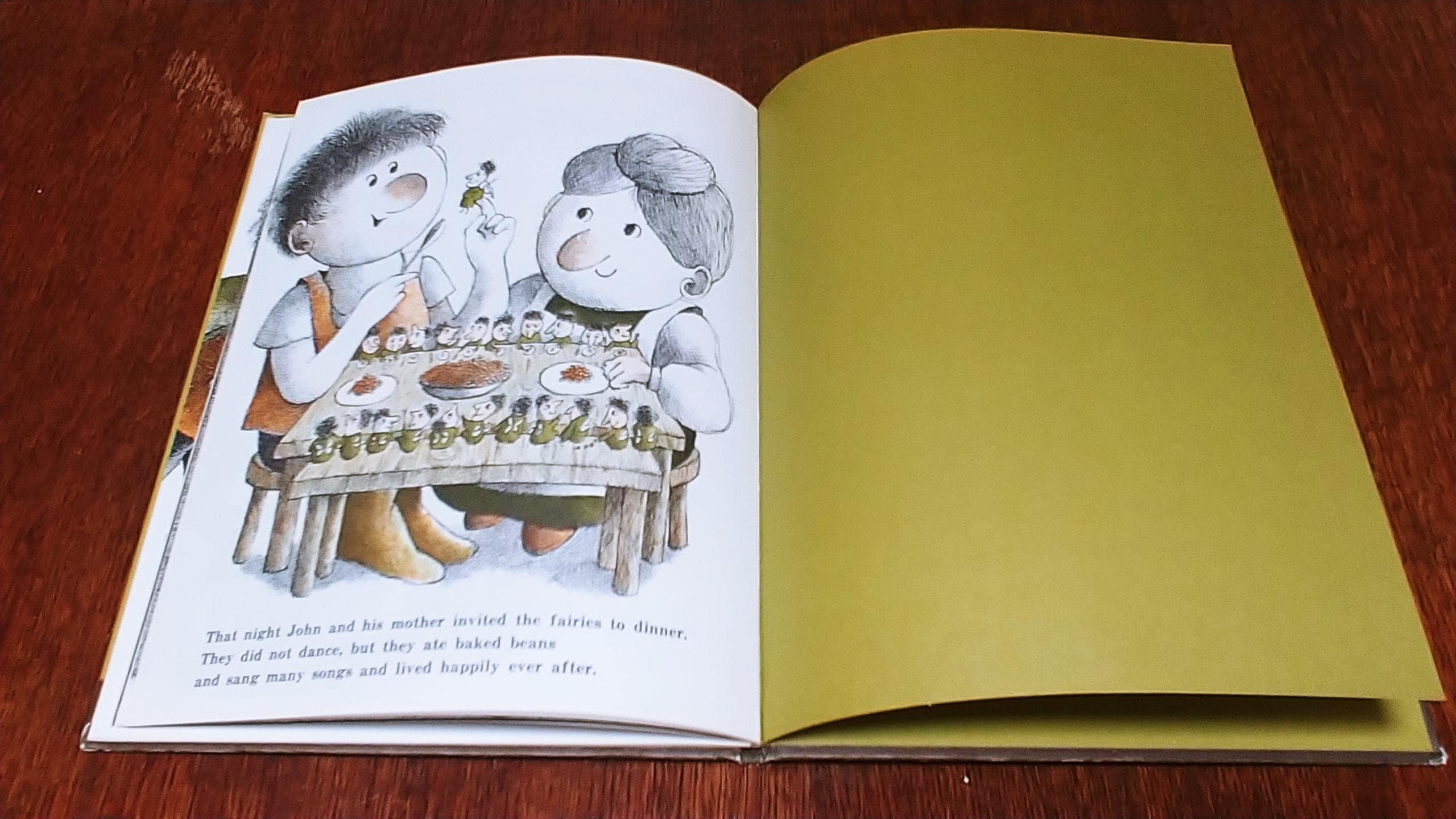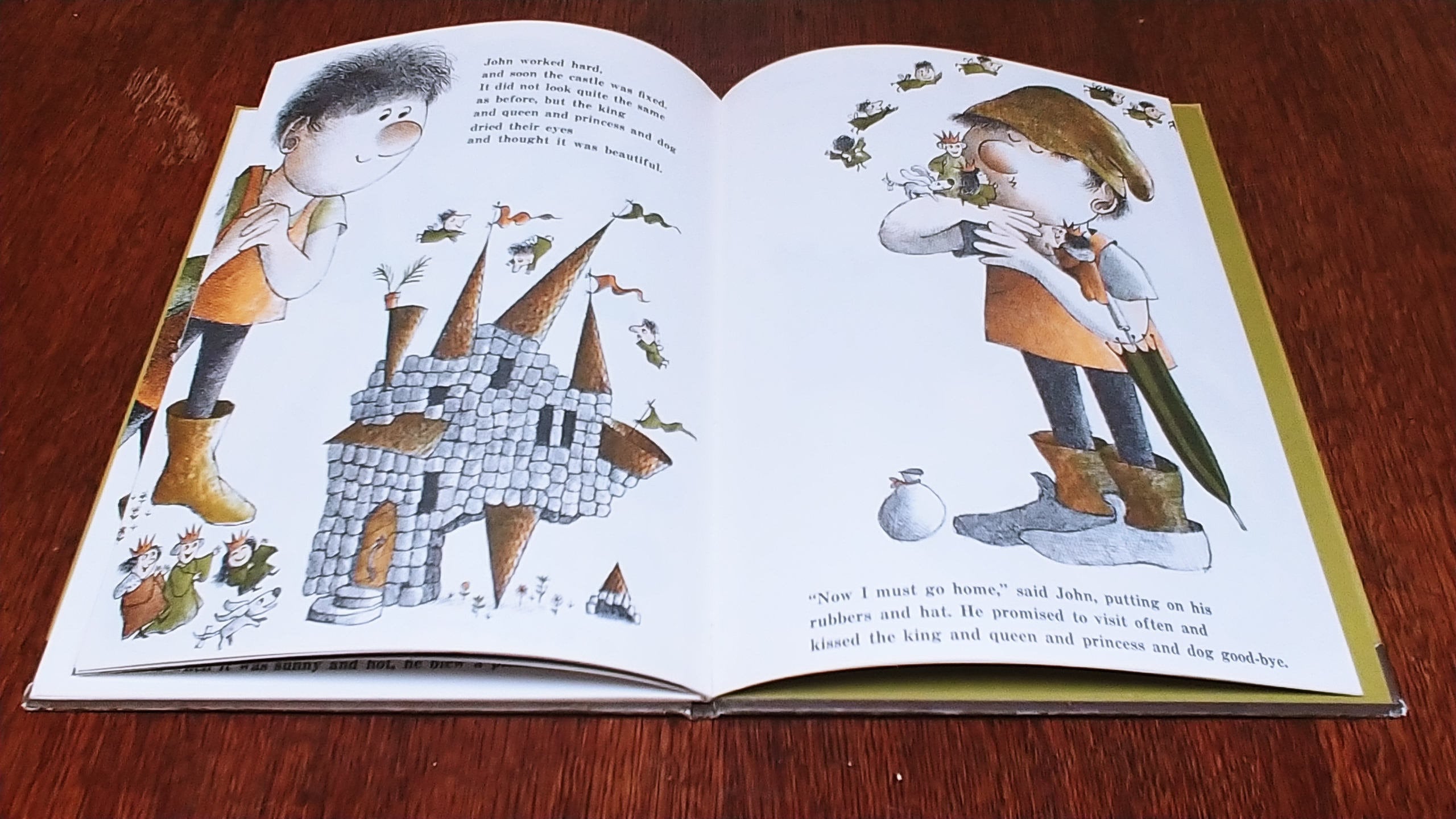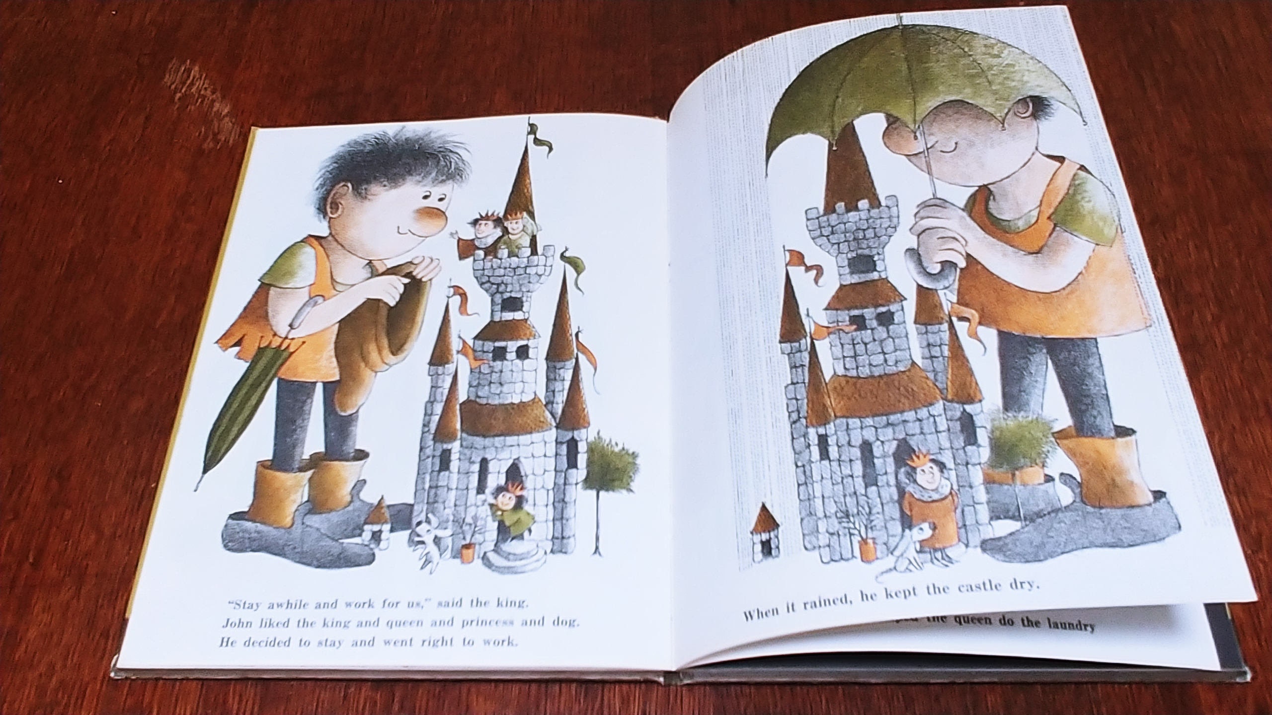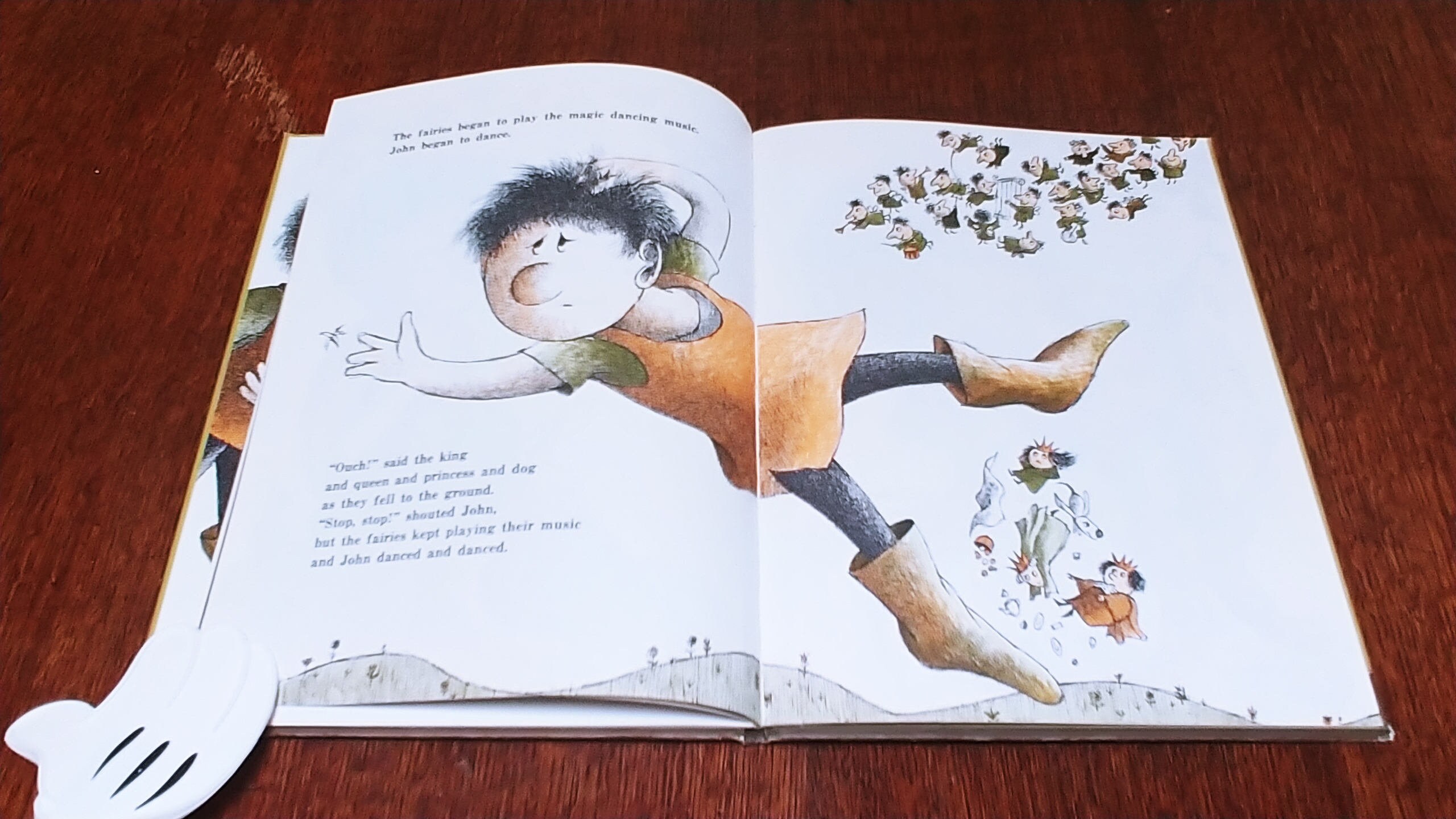 Sweet, kind Giant John and his mother are very poor, "only two potato chips in the cupboard", so John sets out to find a job. He goes to work for a King and Queen who think he's wonderful and pay him in gold. One day, his friends the fairies come to visit, but when they begin to play their music he starts dancing, and can't stop. He dances on the flowers and trees and dances on the castle. But all's well that end's well, and John and his mother live happily ever after.
