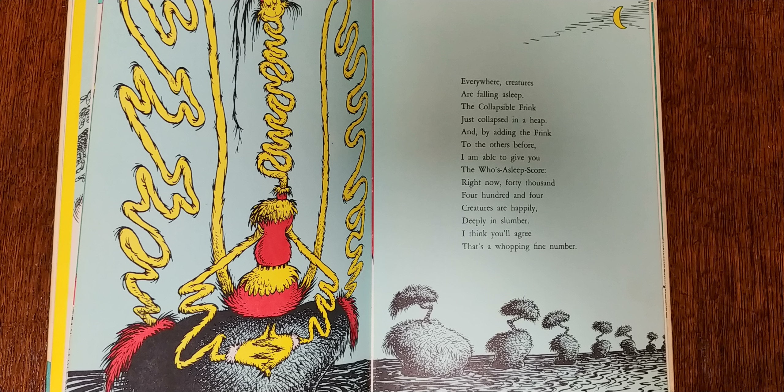 It begins with a sleepy little bug named Van Vleck and includes Biffer-Baum Birds, the Herk-Heimer Sisters, the stilt-walkers, the Hinkle-Horn Honkers, the World-Champion Sleep-Talkers, the Hoop-Soup-Snoop Group, Snorter McPhail and the Snore-a-Snort Band, the Foona-Lagoona Baboonas, the Bumble-Tub Club, a Chippendale Mupp, the Curious Crandles, and the Collapsible Frink. And all are yawning and sleepy and snoring...