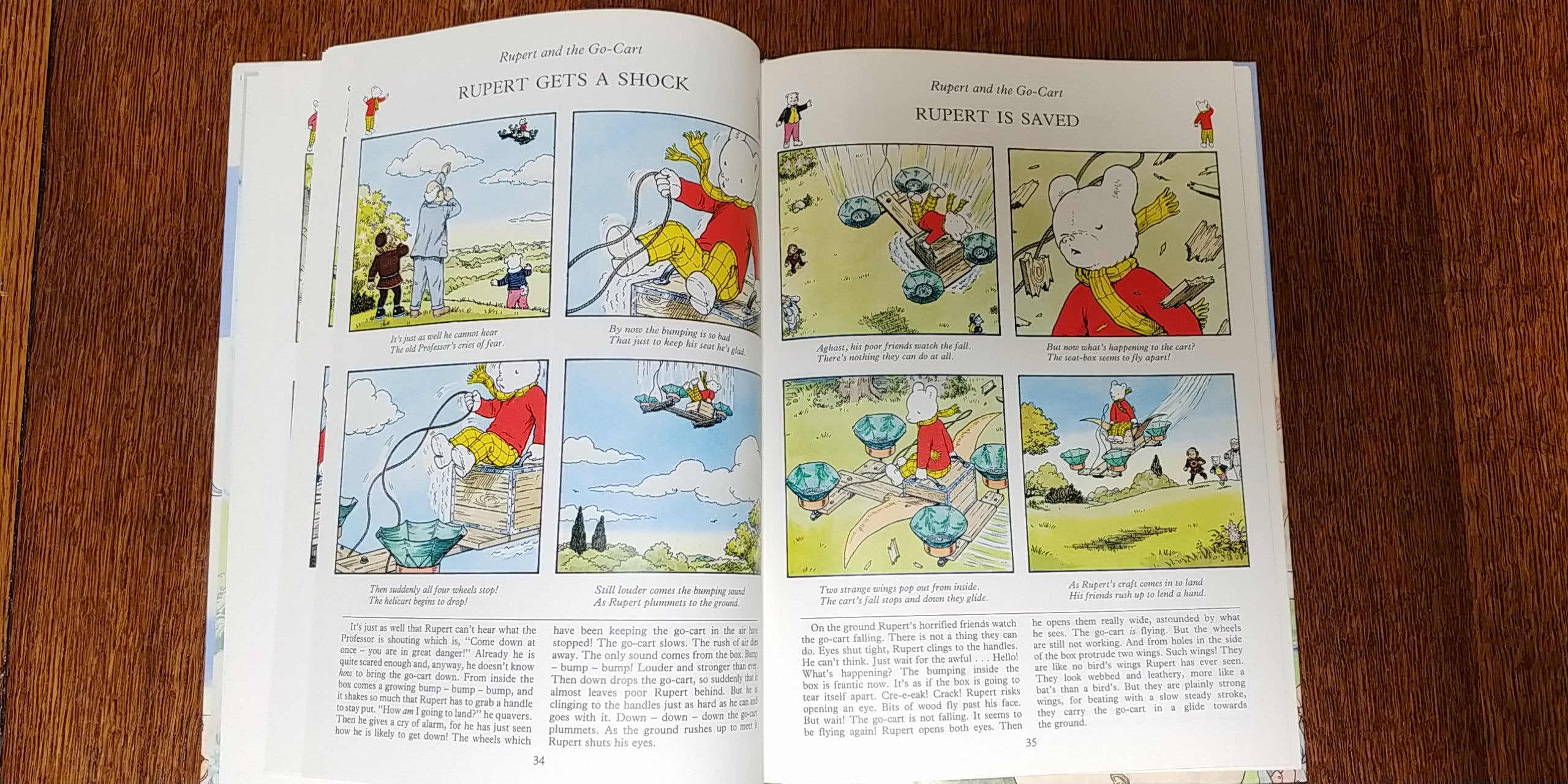 The Rupert cartoons are "text comics", where the full text accompanies the illustrations rather than in speech bubbles and other text devices incorporated into the artwork. The Annuals included games, puzzles, and instructions for paperfolds. For many Rupert fans, the beautifully illustrated endpages are a favorite part of the Annuals, depicting flying umbrellas, elves, dragons and other fantastical creatures, faraway lands, and magical places.