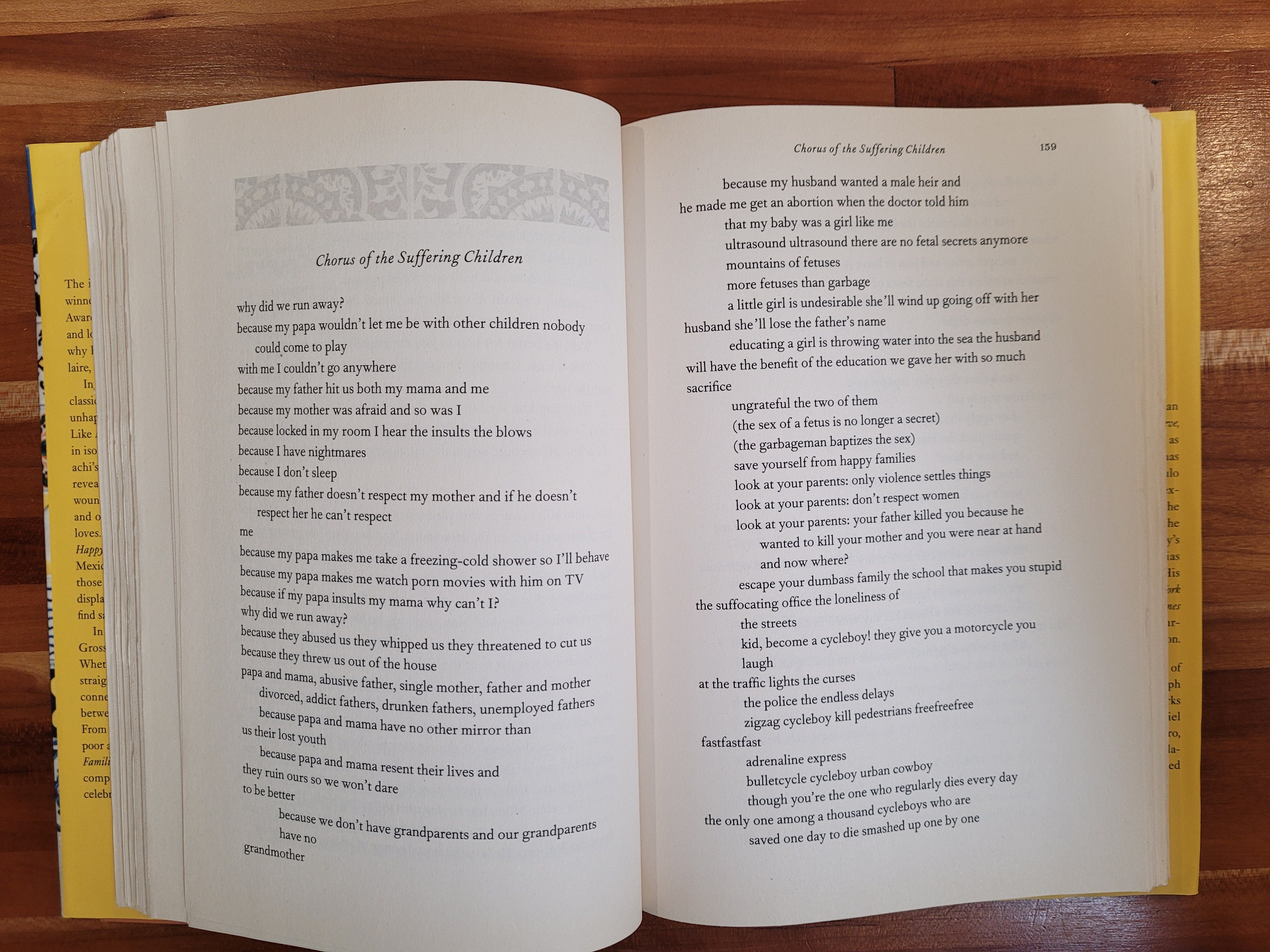 "The Father. Pastor Pagan knows how to wink. He's a professional at winking. For him, winking an eye - just one - is a way to be courteous. All the people he deals with conclude their business with a wink. The bank manager when he approves a loan. The teller when he cashes a check. The administrator when he hands it to him. The cashier when he plans the fool and doesn't inspect it. The chief's assistant when he tells him to go to the bank. The porter. The chauffeur. The gardener. The maid. Everybody winks at him. Headlights on cars wing, traffic lights, lightning in the sky, grass in the ground, eagles in the air, not to mention the planes that fly over the house of Pastor Pagan and his family the whole blessed day. The feline purr of the engines is interrupted by the winking of the traffic on Avendia Revolucion. Pastor responds to them with his own wink, moved by the certainty that this is dictated by good manners. Now that he's on a pension, he thinks of himself as a professional winker who never opened both eyes at the same time, and when he did, it was already too late. One wink too many, he thinks in self-recrimination, one wink too many. ..."